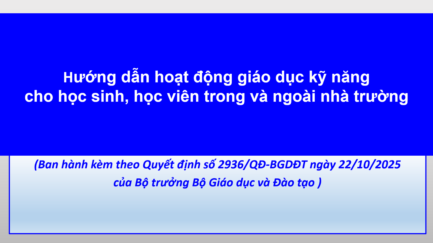 Ngày 22 tháng 10 năm 2025, Bộ Giáo dục và Đào tạo ban hành Quyết đinh số 2936/QĐ-BGDĐT về việc Ban hành hướng dẫn hoạt động giáo dục kỹ năng cho học sinh, sinh viên trong và ngoài nhà trường